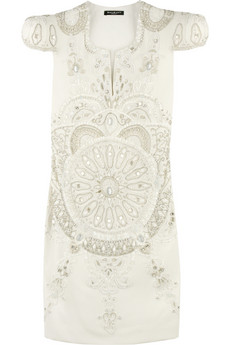 Love the exquisite detail! White silk mini dress with multi-bead embroidery. Balmain dress has exaggerated shoulders, cap sleeves, a V-neck and is fully lined. 100% silk. Dry clean.