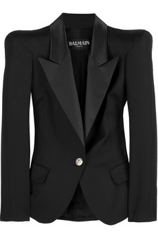 Tailored to perfection! Black wool tailored jacket with a singular embossed button fastening at front. Balmain jacket has padded shoulders, a satin lapel, two faux front flap pockets, long sleeves with embossed button fastenings and a curved hem at front. 100% wool. Do not wash.
