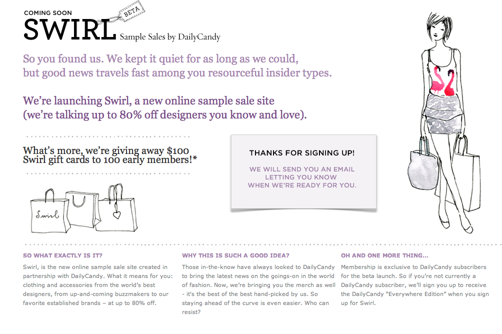Now onto the sweet stuff. Daily Candy is taking their crazy knowledge about everything cool and channeling it into an online marketplace. The best part is that all the wears they will be selling at 80% off. It’s called swirl (and all I could think of was vanilla and chocolate swirled icecream…hello my daily candy).