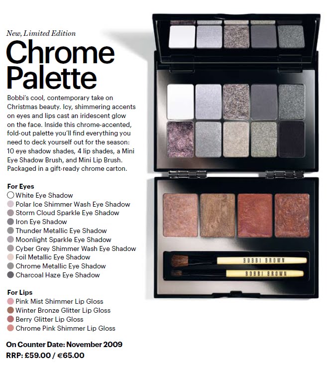 I am lusting after the Christmas 2009 look from Bobbi Brown. The cover makeup is superb. The look is fresh, fabulous and natural and it’s only a look you would find coming out of the Bobbi Brown brand. You can achieve this look with the Chrome Palette, which has everything you would need to recreate this face as well as a number of others. It’s good value for money and great to slide into your purse for New Year’s Eve as you never know when you will need a touch-up or who’s house you will end up in the next morning 😉
