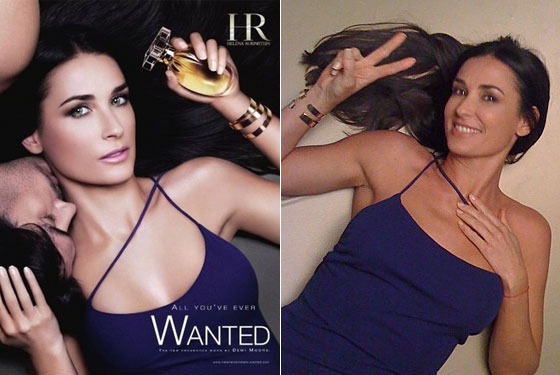That’s right folks. Demi Moore is tired of of all the hoop-la surrounding her photos. She’s confronting the critics and has posted a picture of herself, unphotoshopped, next to a photoshopped image. This is her new perfume ad.
