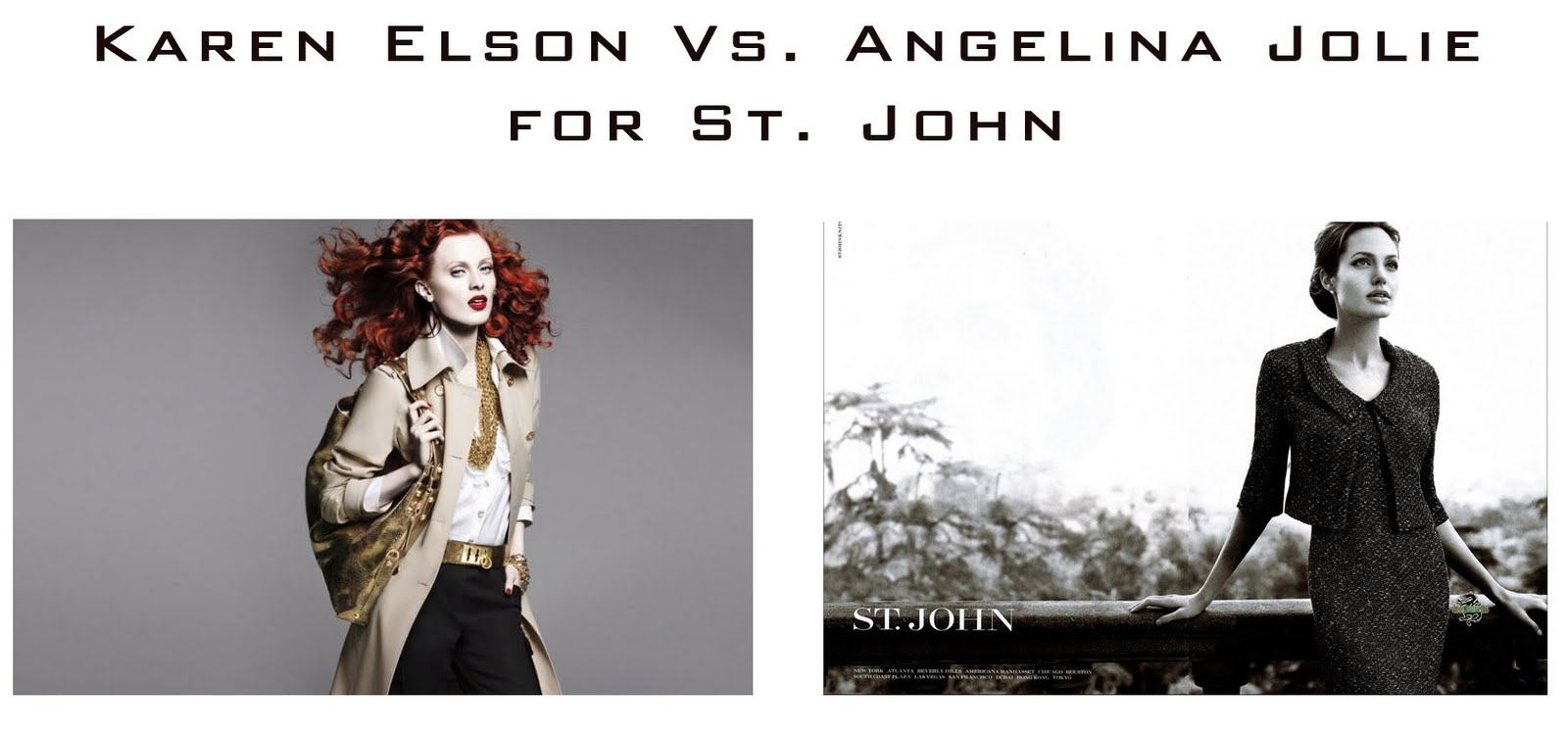 Karen Elson has been replaced as the new model for St. John. This means Angelina Jolie is on the outs. We aren’t quite sure what happened and there are loads of rumours circulating that Angelina grew up too fast for the company but whatever the reason we wish she hadn’t left. It was so nice to see a new face for the brand a few years ago and Angelina truly is responsible for the rebirth of this legendary company. Karen just doesn’t have the same sex appeal. It’s like eating vanilla ice cream just as you were getting used to enjoying Coffee Heath Bar Crunch, there’s no going back from that!