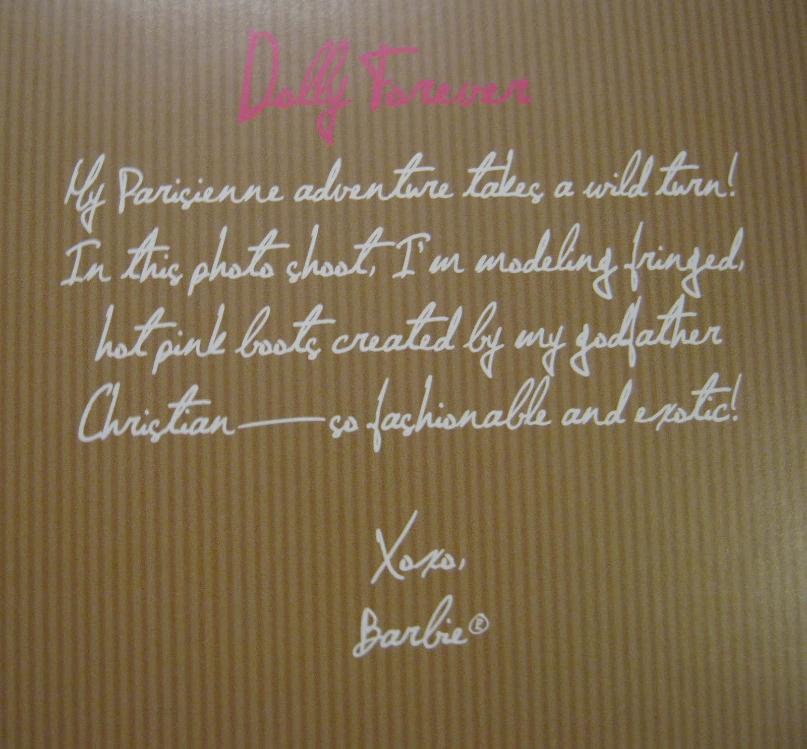 We love the little details that have gone into creating this doll. First off, if you order from Net-a-Porter, the doll (in her box) comes within a huge black Net-a-Porter box, which we must admit is just about the best box ever to receive through the post. We’re convinced the black box has special happy hormones that are released when your hands grasp it’s smooth edges. I digress…the box for the Barbie Doll itself is a marvel. The Louboutin logo is everywhere and on the back of the box you have a lovely scenic print of Paris and this little ditty at the top: