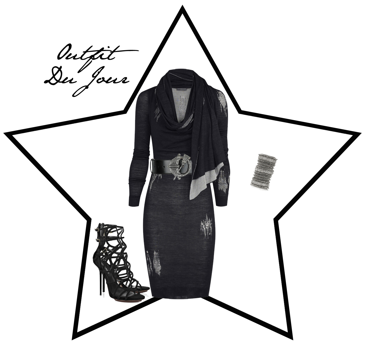 Alexander McQueen Distressed silk-knit pencil dress Emilio Pucci Multi-strap suede sandals Alexander McQueen Celtic-buckled leather belt Philippe Audibert Manchette Aby Mini Amélia cuff