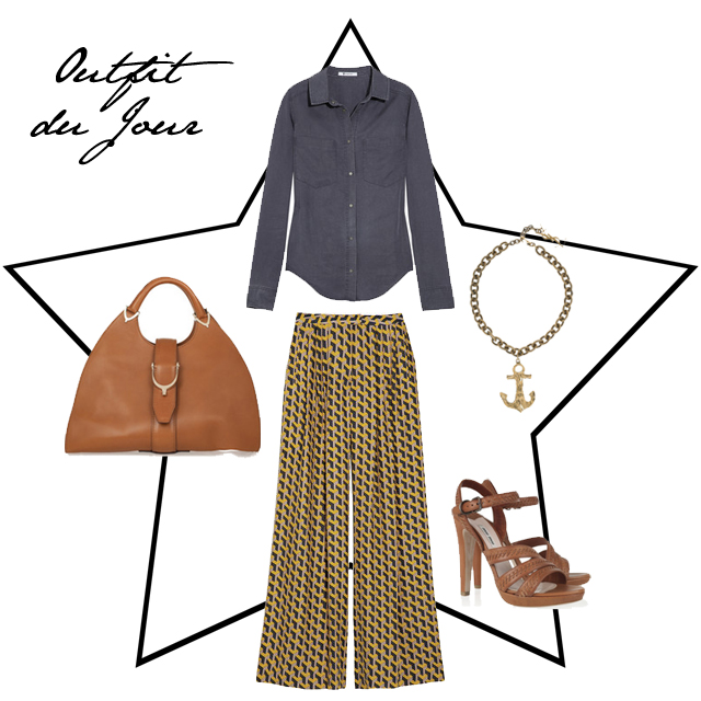 Rag & bone Racine printed silk palazzo pants £385 T by Alexander Wang Chambray shirt £165 Yves Saint Laurent Gold-plated anchor necklace £510 Miu Miu Whipstitched leather sandals £420 Gucci Stirrup leather tote £1,620