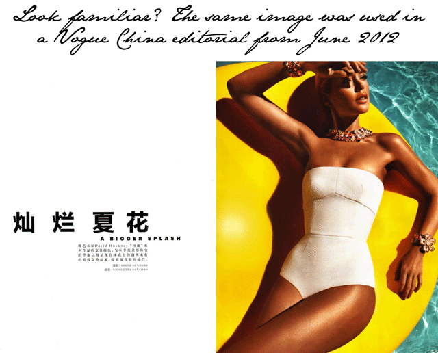 Wondering why Vogue Portugal‘s August cover featuring Doutzen Kroes looks so familiar? It may have something to do with the fact that it was only two months ago we were swooning over the same image of Doutzen in a summer fashion editorial in Vogue China. Of course, recycling images between titles is not exactly huge news as it does happen all the time. However, just a thought against recycling earlier images- Doutzen’s showcasing looks that are either in the sale or already off the shelves entirely. It’s almost as bad as Kate Middleton wearing a dress that hasn’t been on shelves in years. It all just creates fashion angst among glossy-led shoppers!