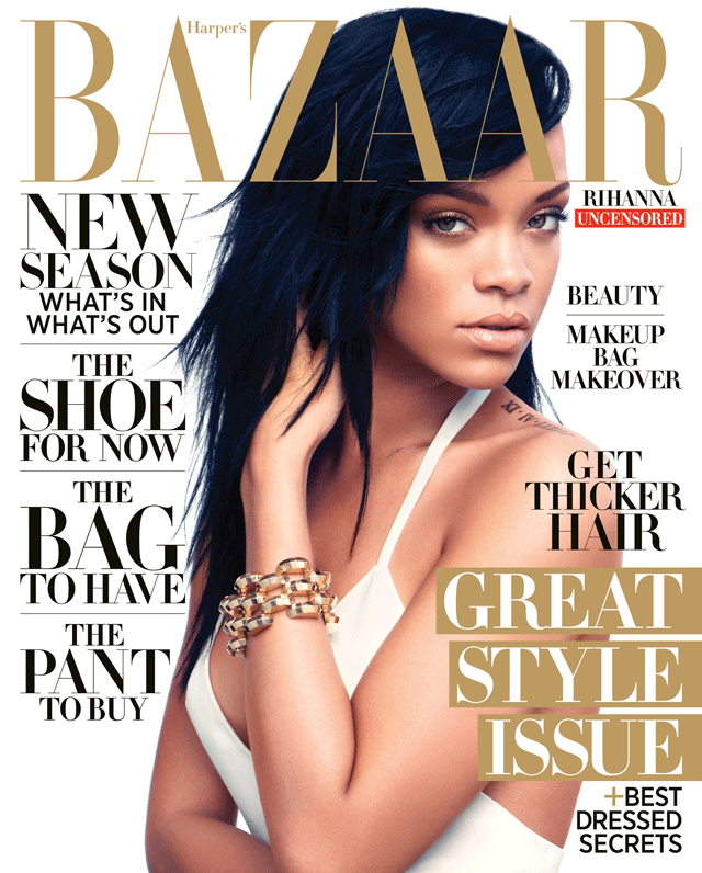 Rihanna covers Harper’s Bazaar August 2012 looking almost angelic in Calvin Klein Collection. In the issue, due to hit stores on the 17th of July, Rihanna talks about missing her bootie, being afraid to fall in love again and eating “everything in life.” Within the magazine Rihanna wears Ralph Lauren, Balmain, Tom Ford and more Calvin Klein Collection. Now let’s just take a moment and discuss those ferocious snakeskin boots and gold dress, both from Tom Ford, on the subscriber’s cover! Swoon!!!!
