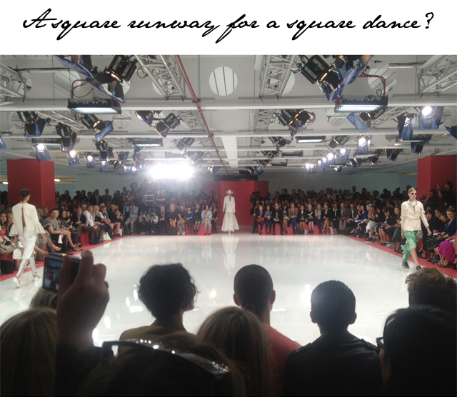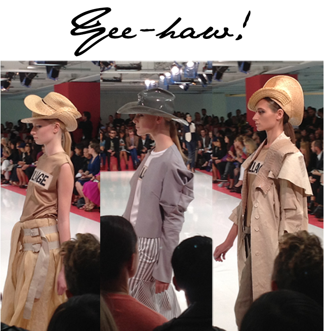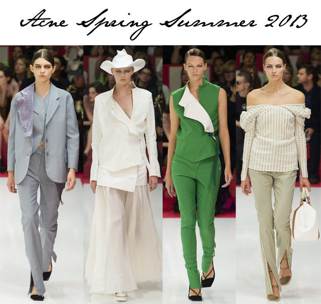 Acne’s Spring Summer 2013 show notes begin with a quote from Emmylou Harris’s Wrecking Ball, “Meet me at the Wrecking Ball, Wrecking Ball, I’ll wear something pretty and white and we’ll go dancing tonight.” What does it all mean? Well after seeing what looked like a square ice skate rink in the middle of the room, I thought we might be in for a bit of a square dance. Then came the cowboy hats down the catwalk, sometimes two hats piled as one, and I was wondering if I wasn’t headed in the right direction. There wasn’t any direct mention of a country influence for Jonny Johansson’s Acne show but he did note that he was greatly influenced by music. Could he have been listening to some Dolly Parton as well as Emmylou when designing the collection? I like to think so. I like to picture Johansson sketching away as Dolly’s 9 to 5 is blaring on the studio sound system.