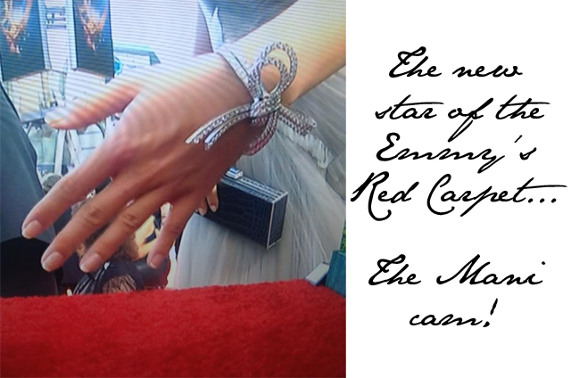 The 2012 Emmy Awards had a new star this year on the red carpet and it took all the celebs by surprise. Apparently, the brainchild of Ryan Seacrest, the “Mani Cam” made it’s debut with some of the leading ladies in Hollywood for the first time last night. Stars were asked to let their fingers do the walking on the first ever “Mani Cam” red carpet. E! news had all the breaking nail news as well as bringing us the bling up close and personal from names such as Emily Van Camp. The image you see above is of Emily’s beautiful Van Cleef & Arpels bracelet paired perfectly with a french manicure. This has to be the winner for the “Mani Cam” red carpet… if of course we were judging. Talk about some seriously fashionable arm candy. Don’t even want to think of the price tag attached to such an item!