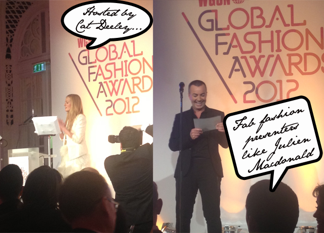 Earlier this week Fashion Foie Gras attended the WSGN awards in London at the Savoy. The awards, previously held in New York City, honoured some of the biggest names in the industry with a prestigious Global Fashion Award. Winners included Victoria Beckham (who accepted via video), Kim Jones for Louis Vuitton, The Cambridge Satchel Company, Mr Porter, Topshop and Charlotte Olympia. Celebs filled the ballroom and lined the stage as presenters included Cat Deeley, Pixie Lott, George Lamb, Julien Macdonald and many more. It was certainly a night to remember. Here’s a look at some of the highlights for the evening.