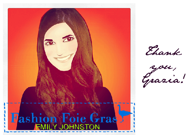 This is more or less a huge thank you post to Grazia, because truly they deserve it. After a rather long day I received this magnificent surprise, a portrait from the very talented Lula. For fashion week this year Grazia put together a wonderful space called The House of Grazia. Today, they had an artist in residence who was commissioned to do what she does best… create. She sat herself down and created, amongst other things, 11 portraits of bloggers in London. I feel quite honoured to be a part of the “pack” as some of the leading ladies in the industry are represented. And yes, I am printing this little guy out on my colour printer as we speak and throwing it on to the office bulletin board to remind myself to smile, no matter what the situation!
