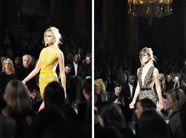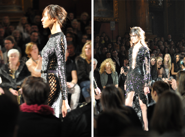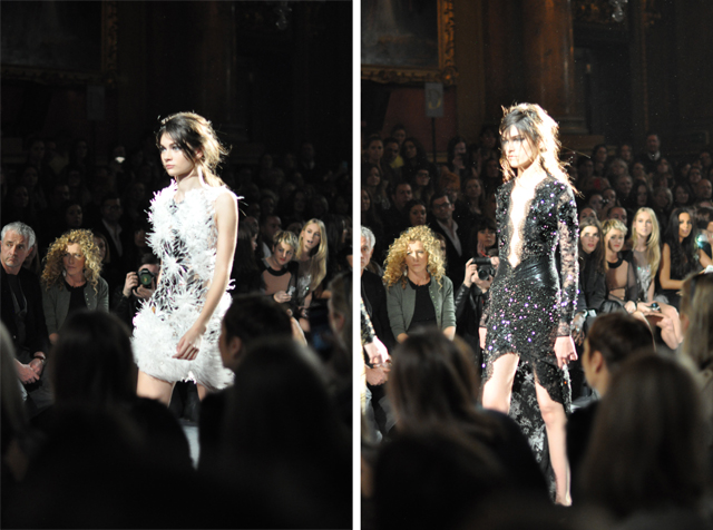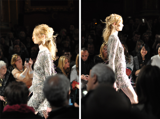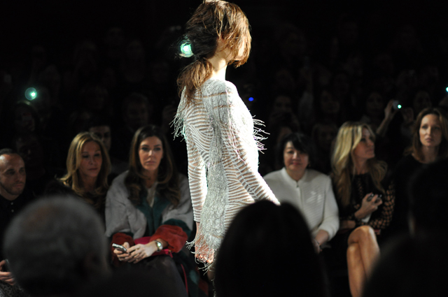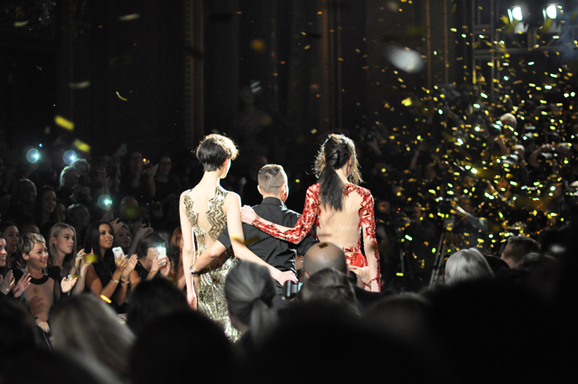 It seems Julien spent a lot of time playing with sheer in this collection. It was almost as if he were looking to see just how sheer he could take things without crossing the line. Let’s just say he tread very close to the edge, but it was worth every moment of risk. His sheer panels and bodices were adorned with everything from sequins to metallic shag, making these some serious red carpet statement pieces. Judging by the reactions in the room, I think it’s safe to say we’ll see plenty of these pieces catching flash bulbs in no time.