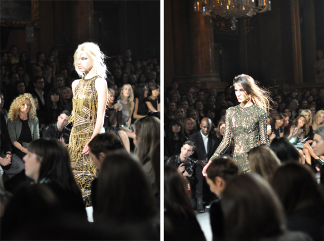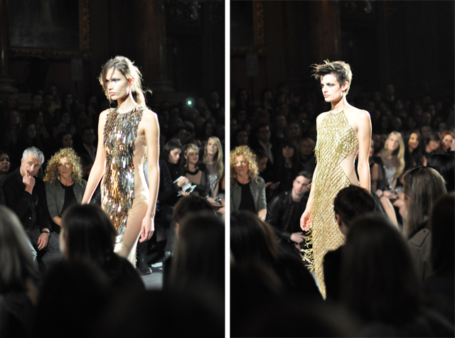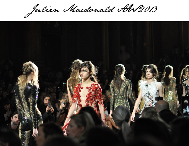 Julien Macdonald presented his autumn winter 2013 collection in the beautiful Goldsmiths Hall in London this afternoon. Guests were greeted by handsome waiters holding towers of chocolate and large glasses of champange, always a mood changer, and were encouraged to relax and greet old friends as the room was readied for the collection’s big reveal.