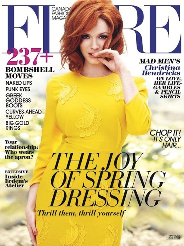 Christina Hendricks is looking ready for the spring blossoms on the cover of Flare Magazine May 2013. The actress is radiant in a yellow frock from Stella McCartney. If there were ever an argument for dressing for your shape, this is the best I’ve seen so far. Christina Hendricks is styled in a way that shows off her tiny waist and fabulous curves from top to toe. Ladies, if you’re working an hourglass figure, don’t hide that envious frame. Be bold with an outstanding colour and call attention to the wonderful waist. {Flare Magazine}