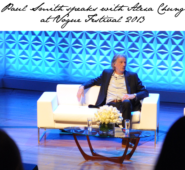 This afternoon Sir Paul Smith bounced onto stage alongside Alexa Chung for the 2013 Vogue Festival. Rather than setting straight into the questions, Smith took ten minutes to address his adoring fans and talk about the idea of inspiration. A quote was projected on the big screen above him that read “You can find inspiration in everything. If you can’t then you’re not looking properly.” Wise words, indeed, Sir Paul. He proceeded by showcasing images of various photos, such as beach huts or travel snaps, followed by images of the designs that were inspired by the colours or shapes in the photos. Basically he was sending a clear message that “it’s all there if you want it.”