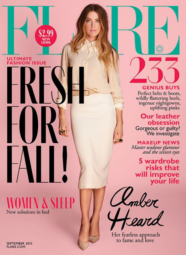 Flare Magazine have chosen Amber Heard as their cover girl for the September 2013 issue. The actress looks rather tame for the cover in an outfit we are calling “modestly mute.” Working with an off-white and nude colour scheme, Heard is dressed in a blouse from The Row, a skirt from A.L.C. and Christian Louboutin heels, naturally. This is certainly a different look for the actress who we recently saw out with Johnny Depp in London.