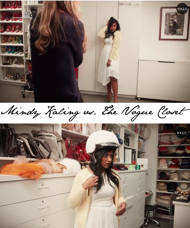 So you’d think Mindy Kaling would go crazy in the Vogue closet, wouldn’t you? Well, in the video you are about to see, she actually gets shot down on just about everything and instead of coming out looking like the hip girl she is above, she comes out looking a bit more reserved. As she accurately points out, she’s channelling a young Laura Bush. Must watch…