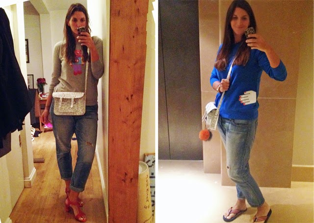 | Days for casual comfiness: Gap Boyfriend Jeans in both pics, Markus Lupfer Robot Sweatshirt on left, Lulu Guinness for Uniqlo Sweatshirt on right, Cambridge Satchel Company Punk-A-Rama bag, |