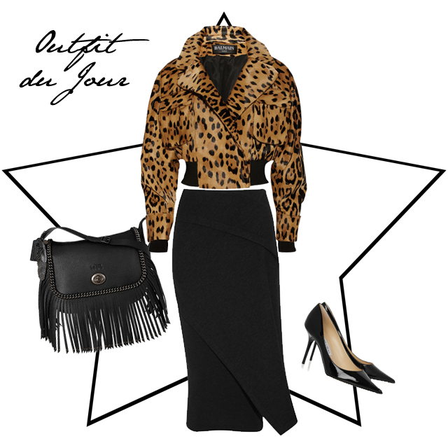 Balmain Leopard Jacket £6,875, Donna Karan Skirt £1,070, Jimmy Choos £360, Coach Dakota Bag £755