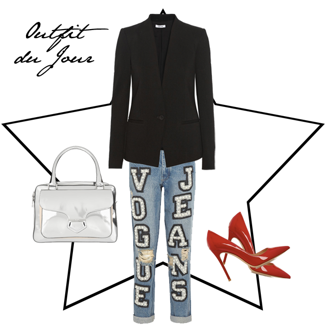 Emily 15th October outfit du jour Outfit du Jour: Representing VOGUE Helmut Lang Blazer £375, Ashish Vogue Jeans £810, Gianvito Rossi Heels £445, Tods Bag £960