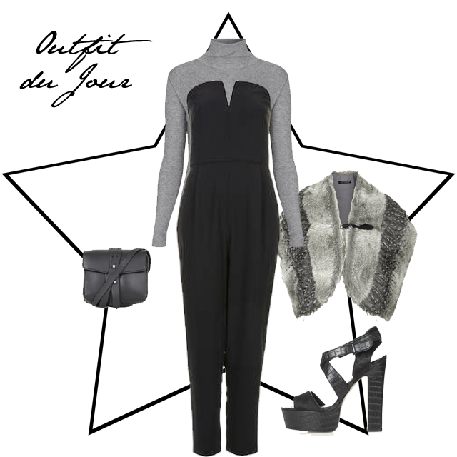 All from Topshop: Plunge Jumpsuit £60, Fine Gauge Ribbed Turtleneck £30, Platform Sandals £55, Faux Fur Cape £35, Leather Belt Bag £28