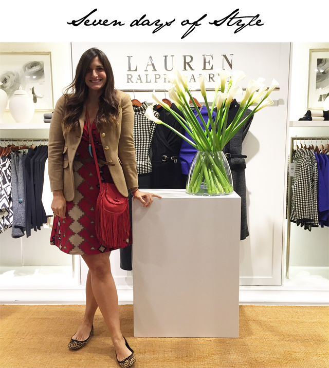 In the meantime, we’ll start this week’s seven days of style with the look above, featuring a dress I absolutely fell in love with while working with Ralph Lauren and John Lewis for their Lauren by Ralph Lauren autumn winter collection. This is the Lauren by Ralph Lauren Charmee wrap dress (available on Johnlewis.com for £180 or on Ralphlauren.com for $104.99). The jacket is also Lauren by Ralph Lauren and available to purchase on the same websites listed above. Of course you’ve seen this gorgeous fringed red bag before – it’s from Polo by Ralph Lauren.