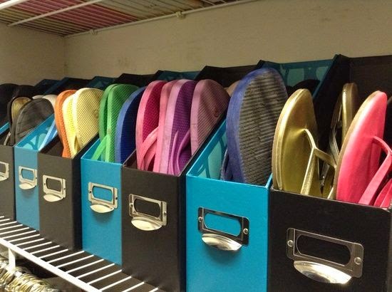 6. A genius way to organize flats and flip flops – old magazine racks.