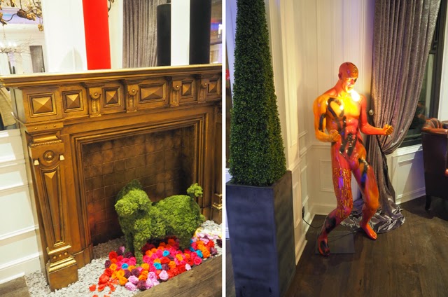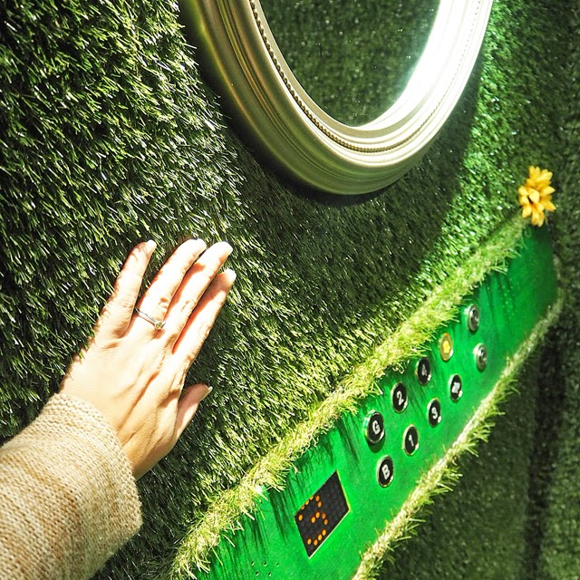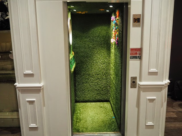 Last week I took a bit of a stay-cation in London to check out the latest hotel offering over in South Kensington. The Exhibitionist is brand new to London, having just opened doors last November. It’s no Holiday Inn, but it’s also no Claridge’s. In fact, The Exhibitionist feels less like a hotel and more like living in an art installation. From the moment you walk in the front door you feel as if you’ve walked into a special show at the Tate Modern. Bright lights, imposing sculptures and Beetlejuice like decor greet you before you meet the lift, which will whisk you away to your room for the evening. I say “meet” because you will never in your life expect to be met with the elevator that greets you. Of course, I quickly began to feel it would be totally out of character for the hotel to turn any corner and not have your socks knocked off. The Exhibitionist’s hotel lift is a garden, of sorts. I’m told they wanted to make their life more entertaining, as it’s an old and very slow way to travel, so they wanted their guests to have some visual candy while along for the ride.