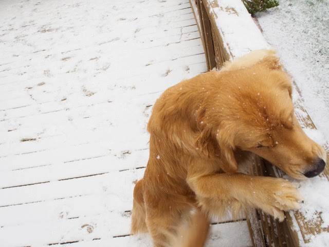 I’m home for a quick visit. Well, I hope it’s a quick visit. Seems the winter weather might have other plans, but fingers crossed I’m back on a flight to London tonight. Yesterday we got a bit of snow. People of the southern states wiped out supermarket shelves yesterday afternoon after hearing we would get between 8-12 inches of snow overnight. We waited and waited and only saw two inches fall over the course of two hours and then the catastrophic snow storm became a fun little flurry of excitement. However, the two inches made for a perfect introduction environment for one Boomer the Golden Retriever. This is Boomer’s first interaction with the white stuff. He, and his brother Brody, woke up to quite an unexpected outdoor adventure.