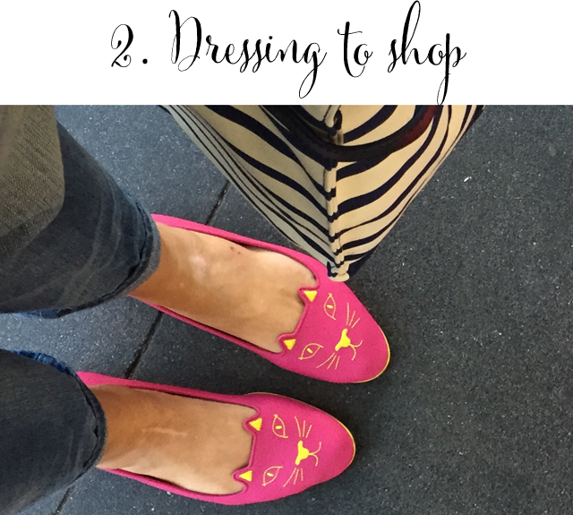 Wear flat, slip on shoes for the day! You’ll want these to be comfortable. Oxford Street is long and there are a lot of shops to cover. Pair the shoes with skinny jeans or leggings and an easy coat to slip and off. You want to be in and out of dressing rooms with ease. The tighter fitting your day clothing, the easier it is to throw things on top without having to undress at all. Also, use a cross body bag so you have hands free to pile up clothing!