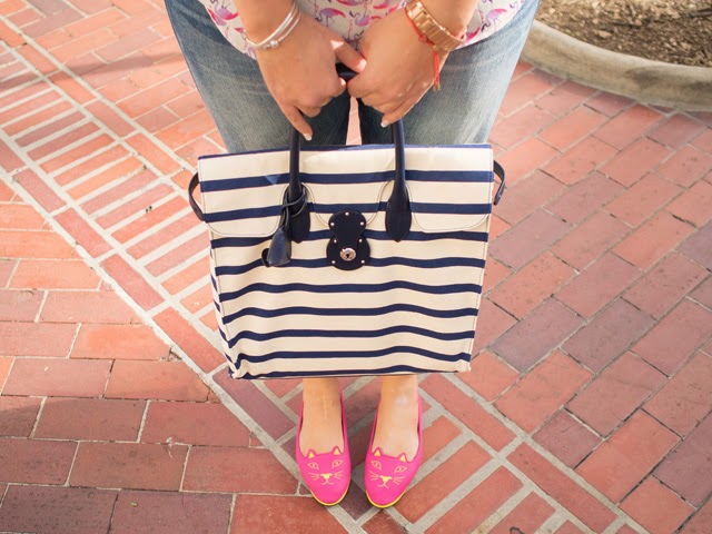 The Marks & Spencer flamingo shirt is exactly £29.50. For £29.50, my day was made and each and every day after that his bad boy gets to come out and play. There is something about a flamingo print that just makes me smile from ear to ear, and I’m proud to share that geeky side of my style. I’m also pleased to report that it’s still in stock. Do you feel the love I’m putting down here? Flamingos… they’re cool again. Get in on the game! (Also wearing Charlotte Olympia Rubber Kitty Flats from The Outnet, Gap Boyfriend Jeans and a Ralph Lauren striped Ricky Tote).