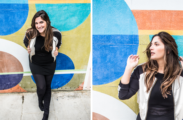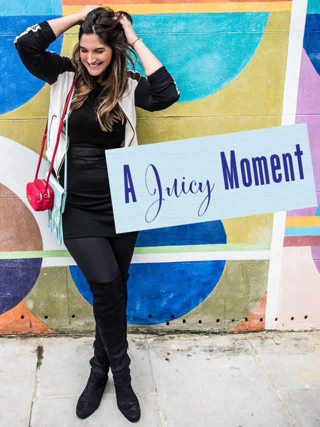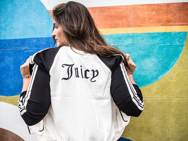 One of the biggest trends of the seasons is the track jacket, otherwise known as the bomber. You can go as simple or as glam with this look as you want. This time around, I’m pairing my Juicy Couture track jacket with a little black dress (that has an amazing waist slimmer lace feature), some over-the-knee boots and a bag or two. Basically, I’m head to toe in Juicy. Hey, it happens.