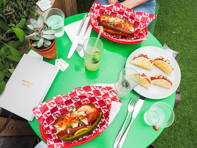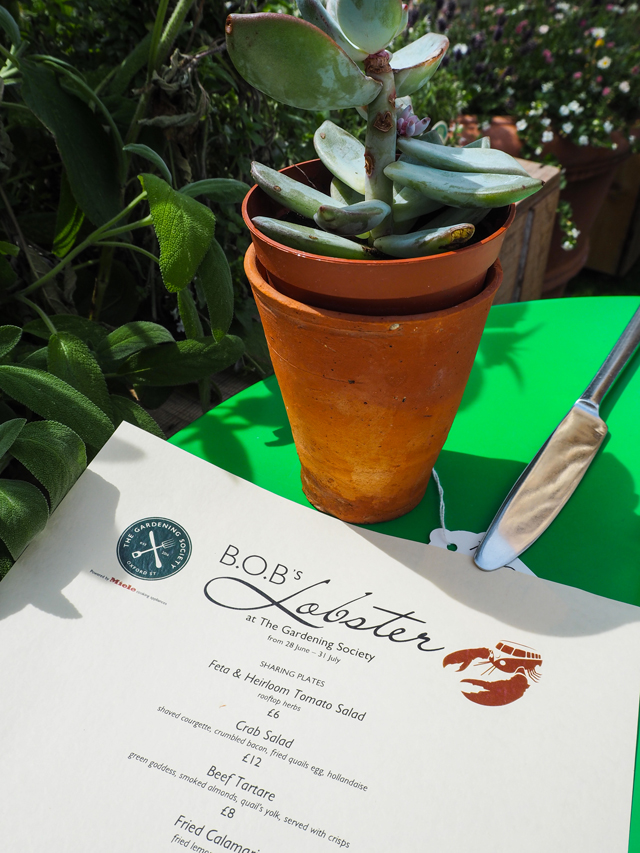 So about this setting. B.O.B’s Lobster is usually a food truck, but it has popped up for the month of July at The Gardening Society at John Lewis Oxford Street in London. What’s that you say? What’s The Gardening Society? Oh heavens me, sit down and take notes. This is the new hot spot in central London for those looking for a little fun in the sun, whether at midday or after work. The Gardening Society is a rooftop garden that is found in the most unlikely of settings. It’s an oasis in a cement jungle. It’s a patch of green in an otherwise grey London world. It’s also a favorite new place for folks to find peace during a quick lunch hour – whether eating at B.O.B’s Lobster or simply enjoying a coffee with a good read.