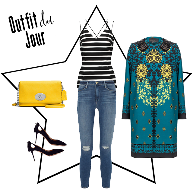 Shop the Look: Bailey 44 striped top, Marina Rinaldi double crepe overcoat, Frame Skinny distressed Jeans, Coach Crossbody bag, Aquazurra Pumps