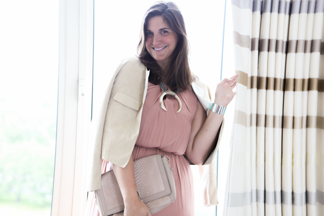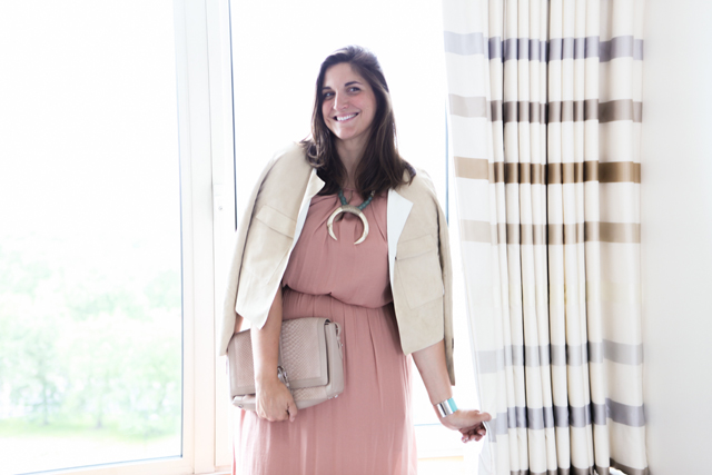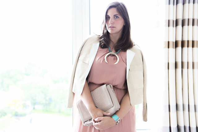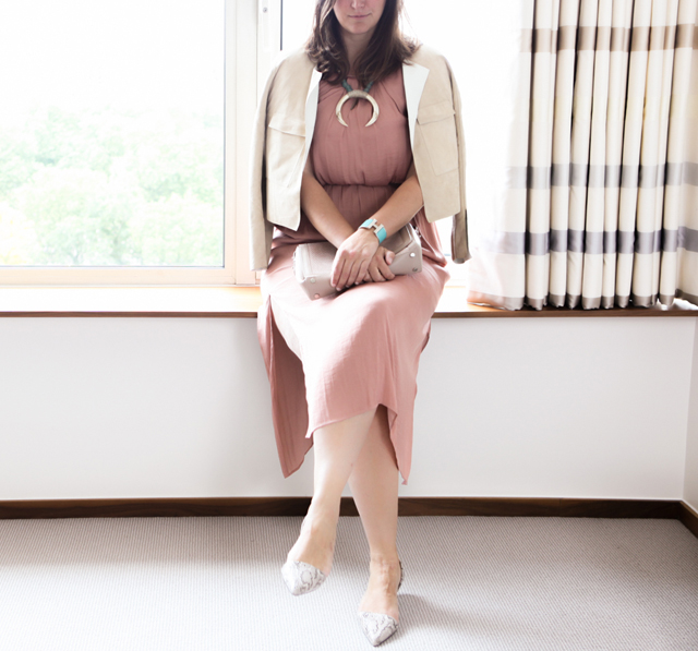Marks & Spencer parachute dress, Marks & Spencer Suede reversible jacket, Aspinal of London clutch, Empire State Finery Necklace