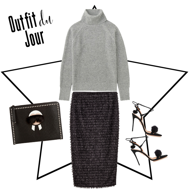 Emily 31st October outfit du jour Outfit du Jour: My go-to holiday skirt! Shop The Look: Marina Rinaldi Fringed Tube Skirt, Uniqlo Sweater, Fendi Clutch, Aquazzura Heels
