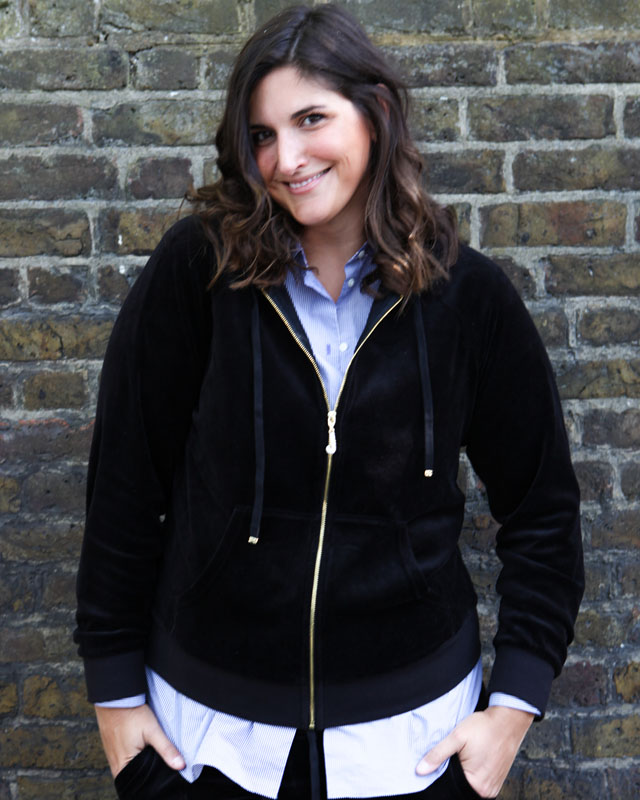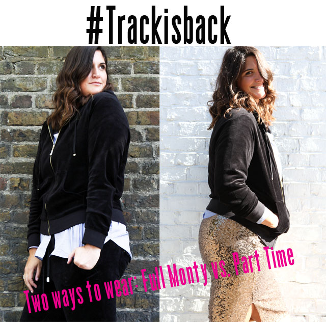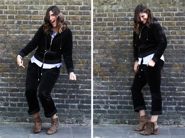 Fast forward to present day and I still have a soft spot for the ensemble, but I’m giving the traditional Juicy Couture black tracksuit a modern day wardrobing update. From full monty (top and bottom tracksuit attire) to hoodie only, I wanted to show how both ways work with the simple change of bottom half! From velour to sequins (also from Juicy Couture this season), I’m presenting two day looks that are easily wearable for dressing up or dressing down the afternoon. All parts Juicy Couture with a pinch of nostalgia and I’m a smiling bunny just thinking of how much fun this was to shoot!