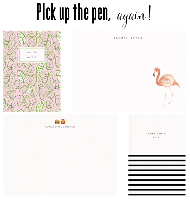Last month I was formally introduced to Papier, a stationary company that is making waves at the moment. After a scroll through their website, I have to admit that the burger and fries personalized stationery was ordered. I couldn’t help myself. There were also flamingos involved – watch out on instagram for a snap of those later. What I’ve discovered is that sometimes such pretty stationery can revive an old habit. I’ve taken to the page once again. I’m putting pen to paper and sending letters to the ones I love, the ones I haven’t communicated with in a while and the ones that I think just need a little something to brighten their day. Trust me when I say that there is power in pens and paper.