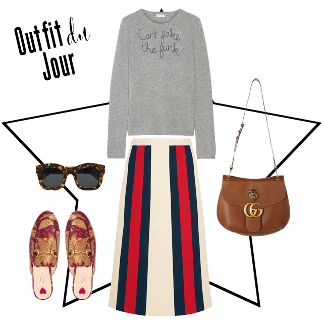 Shop the Look: Lingua Franca Sweater, Illesteva Sunglasses, Gucci Skirt, Gucci loafers, Gucci Body Bag