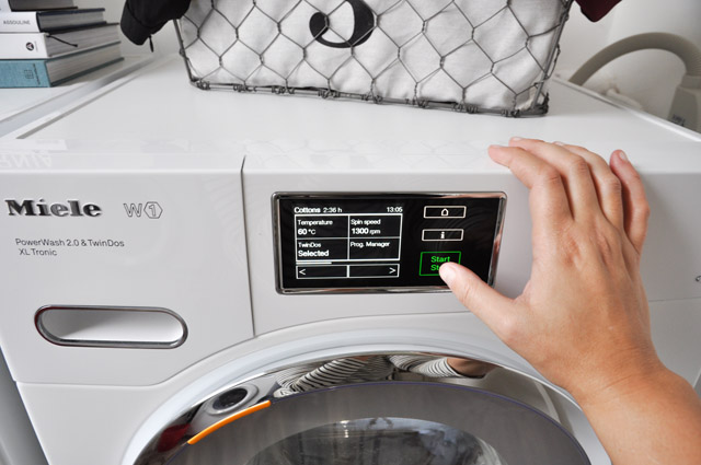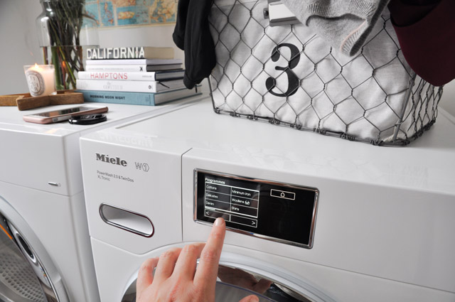 This might just be my favourite feature of all. You can be very specific when you programme each and every laundry load with both the Miele washer and dryer, right down to whether you are washing a pile of jeans or work shirts! No really, there is actually a programme specifically for washing your denim. Say what?! Trust me when I say this is a machine that wants to give your clothes the best life. That’s why I’m calling it my wardrobe fountain of youth. Each programme works with the Twindos to make sure that the right detergent is dispensed. Then the machine takes over. It sets the ideal temperature, cycle and time, and off it goes. This is some sort of fantastic sorcery you think you’d find in a Harry Potter movie, no? **”Holds wand and points to garment shouting “do denim”**