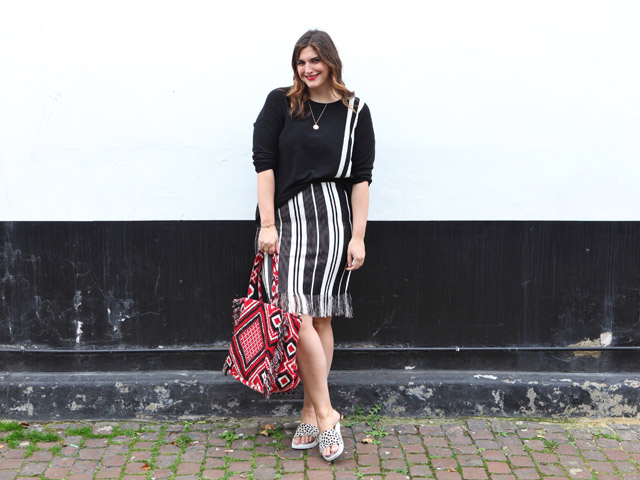 Marks & Spencer Bag, Marina Rinaldi Knit, & Other Stories Skirt, Stan Smith for Adidas Slides