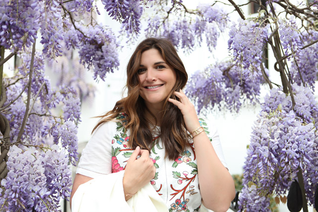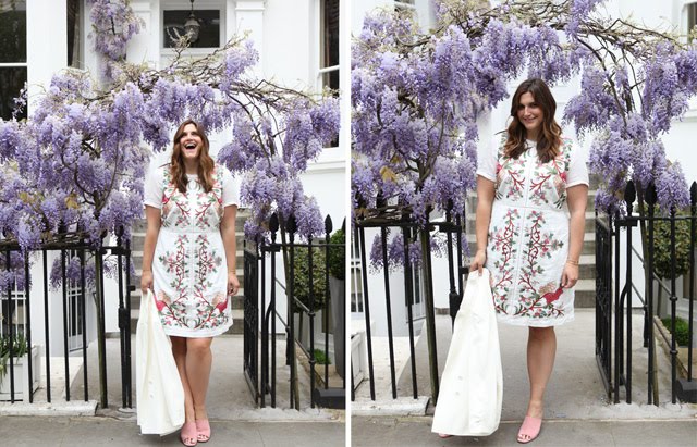 I am pulling out all the stops on promoting this beauty today. It’s not every item of clothing that can hold its own in front of one of the most beautiful displays of wisteria in London, you know. But, this embroidered dress is up to the challenge and showing up the floral display sprinkled around its glorious pink and green embellishment.