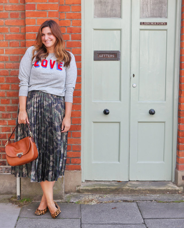 Love Sweatshirt, Camo Skirt, Leopard Block Heels, Saddle Bag