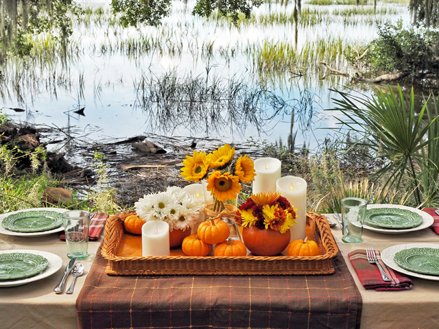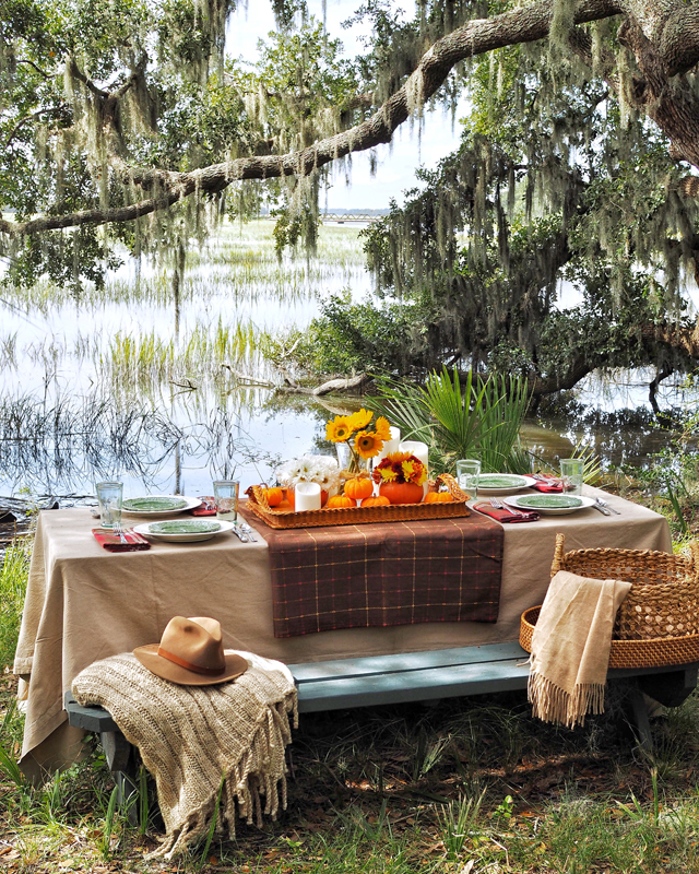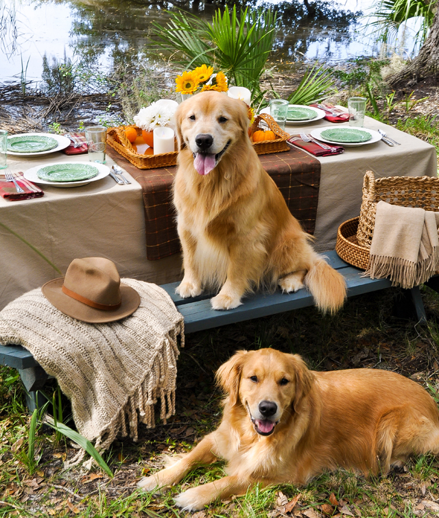The rest of the table is all about creating a cozy atmosphere that’s reflective of the season. There are blankets for laps, if we get a cool breeze. Everything is plaid and neutral to reflect the surrounding colours. Oh, and there are even golden retrievers, that are there mainly because they insist upon it. But, hey, who doesn’t love a golden moment while sipping apple cider and watching the tide roll in?