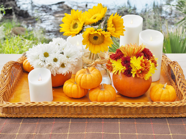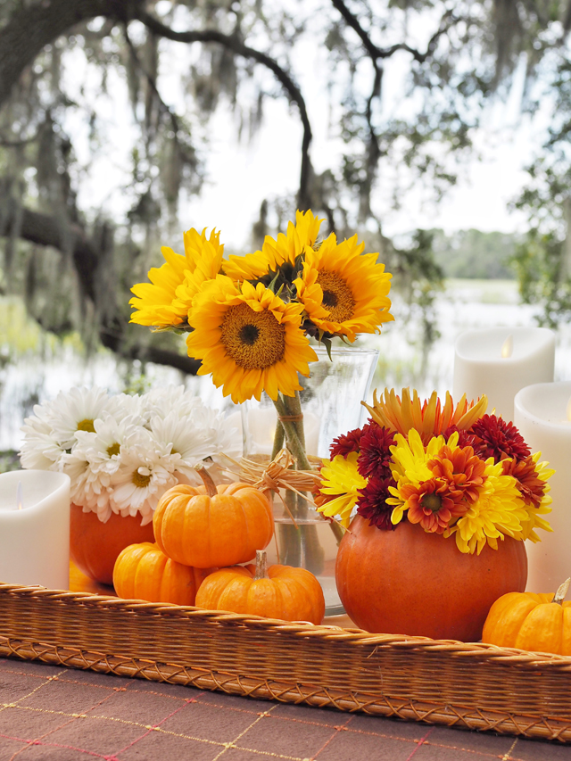 If you’ve never made a pumpkin vase before, it’s as easy as it looks. Simply clean out the pumpkin, just as you would if you were making a jack’o’lantern, only you won’t be making any holes for the eyes, nose and mouth. Nope, your pumpkin stays in one, you just want to make sure you have all the seeds and filling out and are left with a clean interior. Fill the little pumpkin with water and arrange your flowers, and the table’s yours for the taking. If you require a bit more structure with your arranging, put a floral foam block in the base of the pumpkin and pierce it with each flower added!