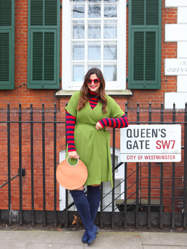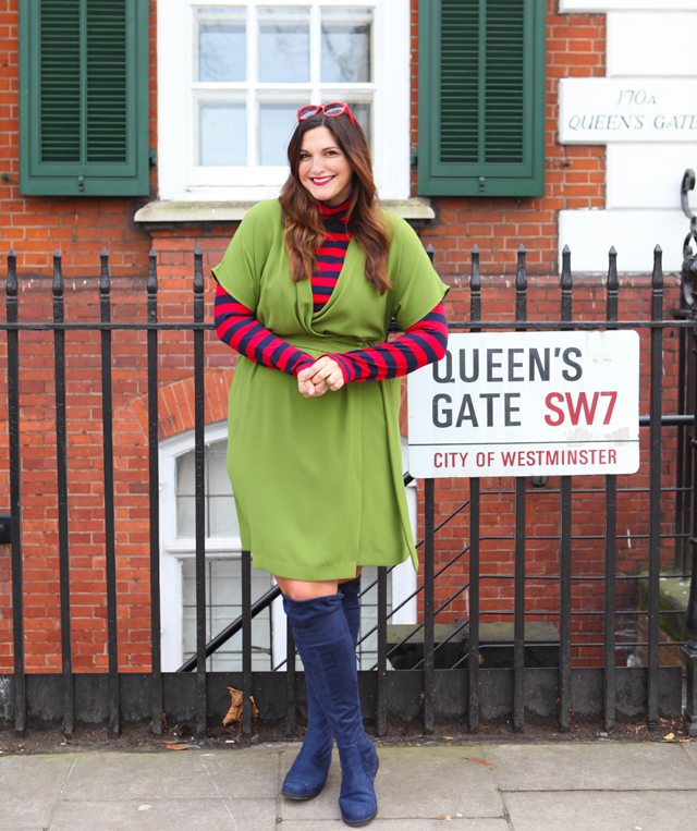 You know what, I took a bit of a risk with this ensemble. I just went for it. I bought a dress, this gorgeous number from Marks & Spencer, and I didn’t want to wait for warmer weather to wear it. The trick is all in the layering. So, I went for something a bit funky, or perhaps just a bit funkier than usual. I put my love of stripes to good use and threw it under said dress, with a pair of over the knee boots and a flashy red accessory to tie it all together. Just call me crazy, but I love it. It might not be everyone’s cup of tea, but I was marching around like the cat that got the cream in this ensemble. Don’t mind me, just wearing next season’s items a whole season early. That’s right. Living on the edge…. of seasons!