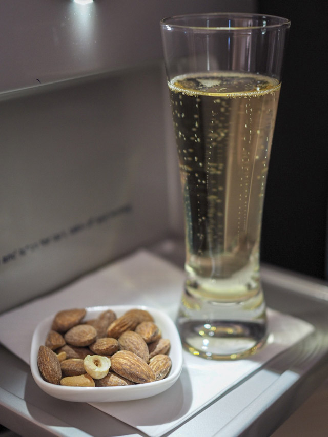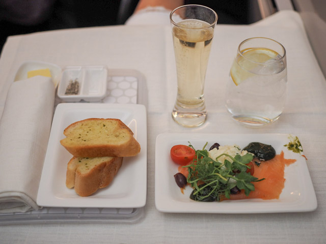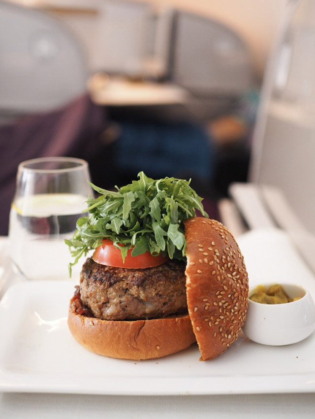 But, I do think it’s time we talked food. Most travel writers will tell you to avoid the food on airplanes in any class, and for the most part I’d agree. But, when there’s a burger on the menu, I always tend to give it a go. Without naming other airlines, I’ll just say that I have had a few in the air in my time and none have ever left me wanting to try another. That being said, I still couldn’t resist giving Air New Zealand’s burger a go. So, I decided to leave sleep for a while and give dinner a try. We started off as meant to continue, with bubbles. I couldn’t possibly resist. After take off I was given champagne and toasted almonds as our first courses were prepared. With a burger on its way for the main, I started with something light to start – smoked salmon and cream cheese with a side of veg. It was delicious and suddenly I found myself with high expectations for the burger.