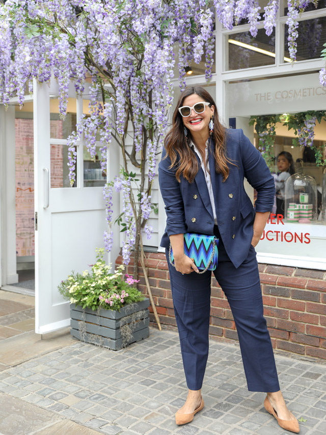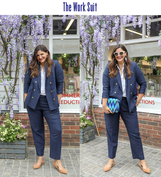 Next up we have the work suit. In this weather, I’m hoping yours is linen! There is so much that can be done to update a basic suit for work. But, if you’re looking for a simple change, simply throw on a statement earring. The bolder, the better! Carrying a bag that pops out in colour will also completely change the look and feel of your work wear!