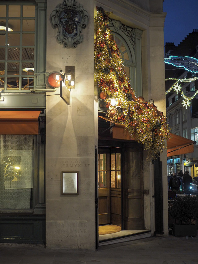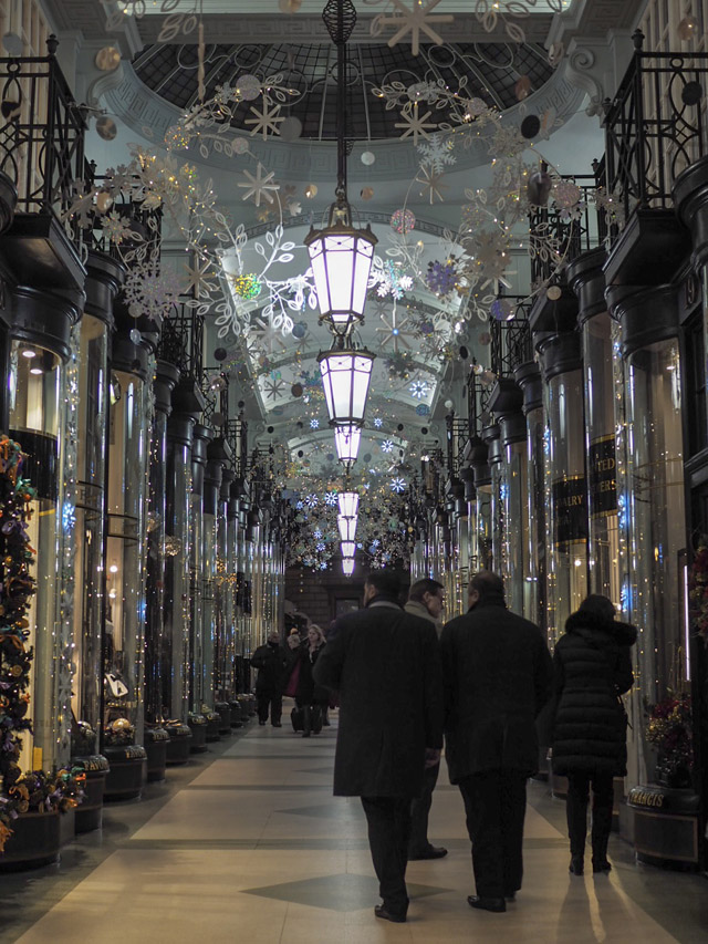 From Sipsmith, we made our way up and down the famous shopping arcades in St. James’s. They were all lit and decorated for the season and featured dozens of swish retail shops taking part in the celebrations with special discounts and the occasional tipple here and there.