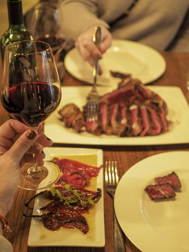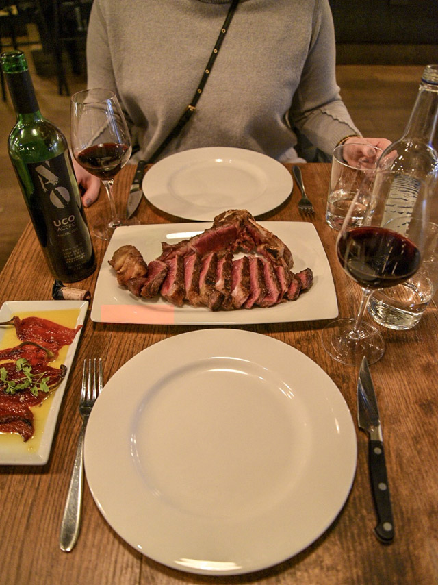However, we found ourselves feeling quite grateful that we didn’t finish our first dish of beans when the slab of beef was presented to our table. The steak was set down with a thud and a challenge, oh and some grilled piquillo peppers. Our waiter made eye contact as if to say, “each and every morsel must be cleared.” The first bite melted on my tongue. The meat was served rare, with a perfect salty crust flavouring. It needed absolutely no sauce, no seasoning, no sides. Straight from the plate, to my mouth, this is what steak lovers’ dreams look and taste like. Let’s just say our stomachs might have been trying to tell us to stop eating but we found room somewhere and barely left the bone with any meat on it by the time the waiter came to collect the plate.